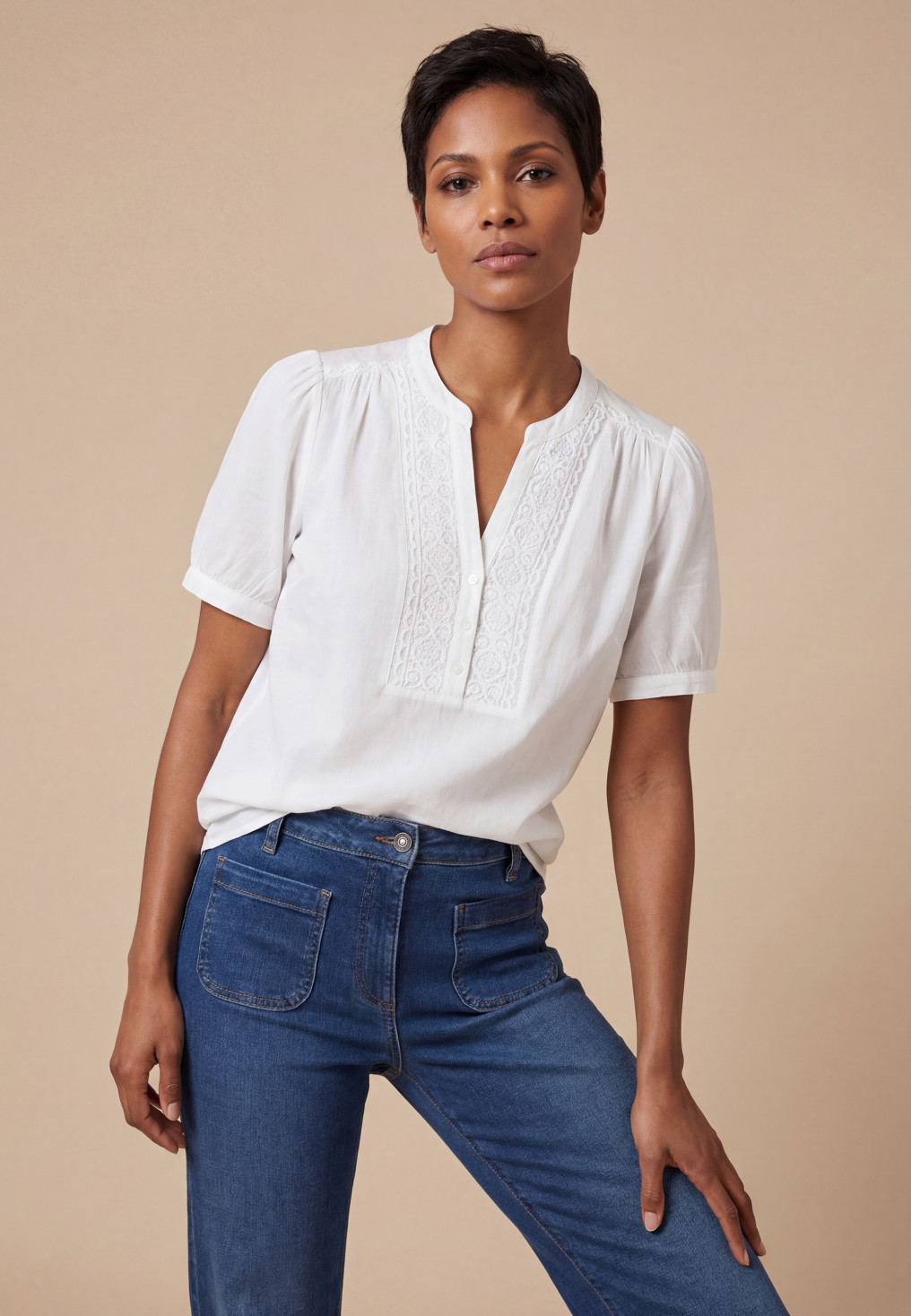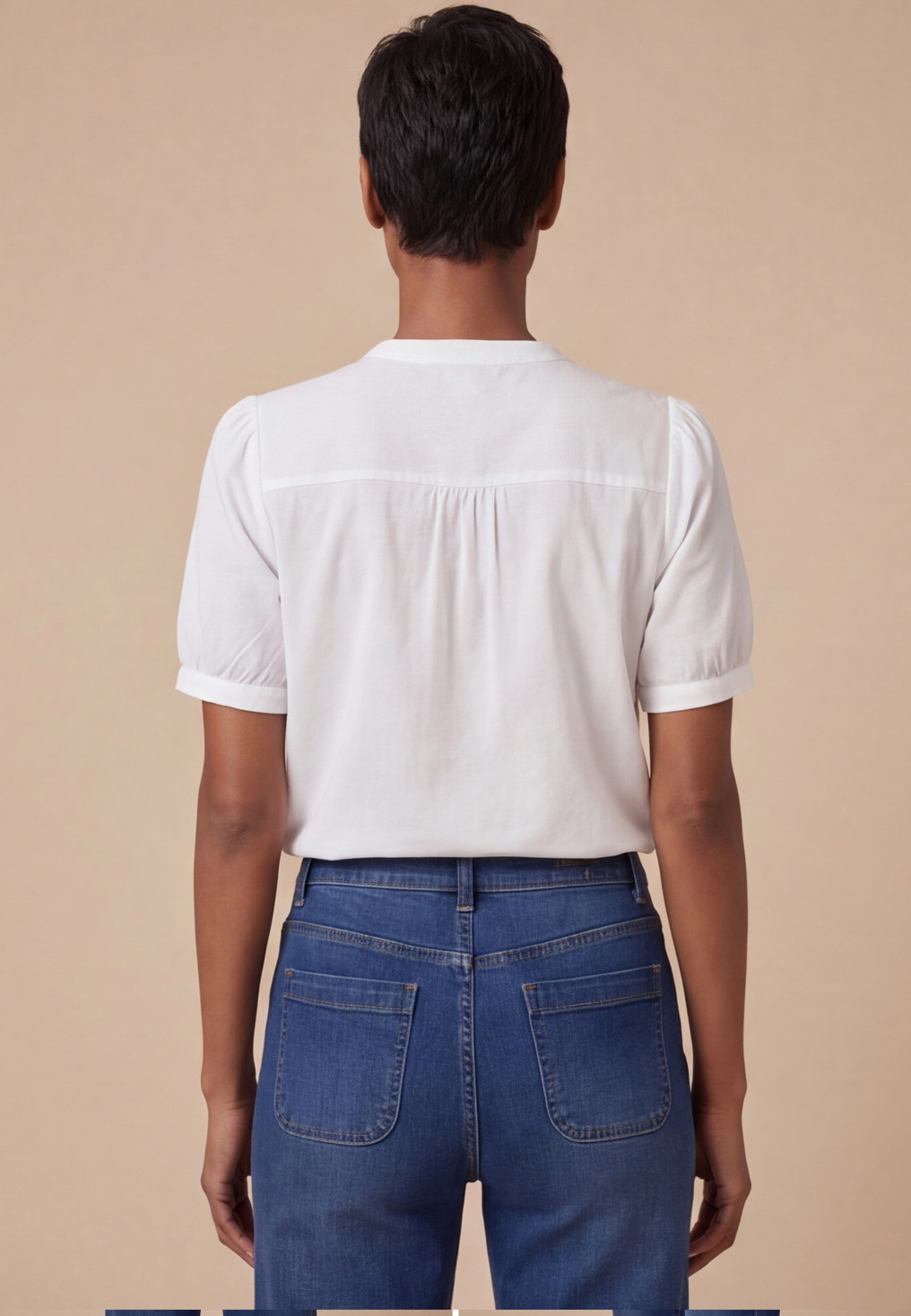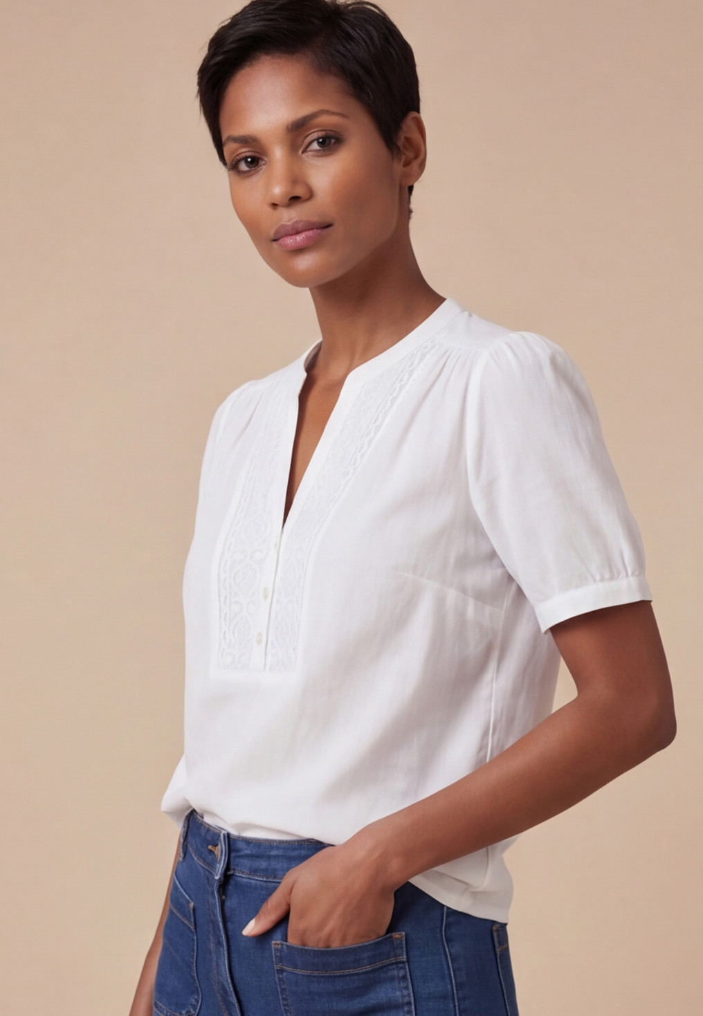 • Encolure ras de cou, ouverte en V sur trois boutons sur patte
