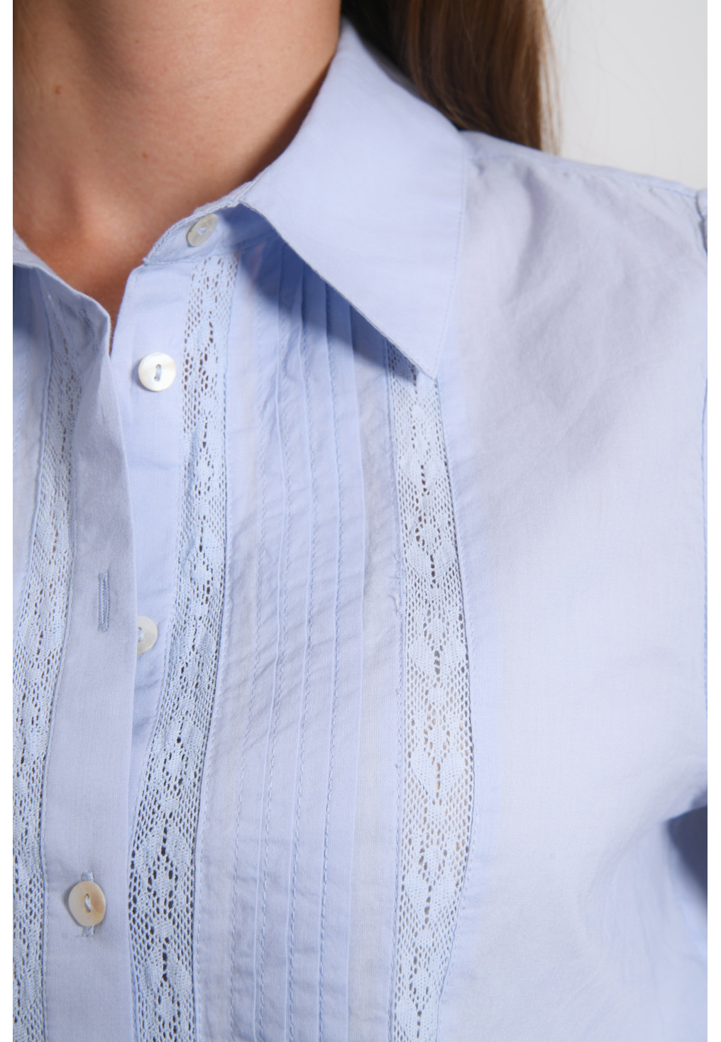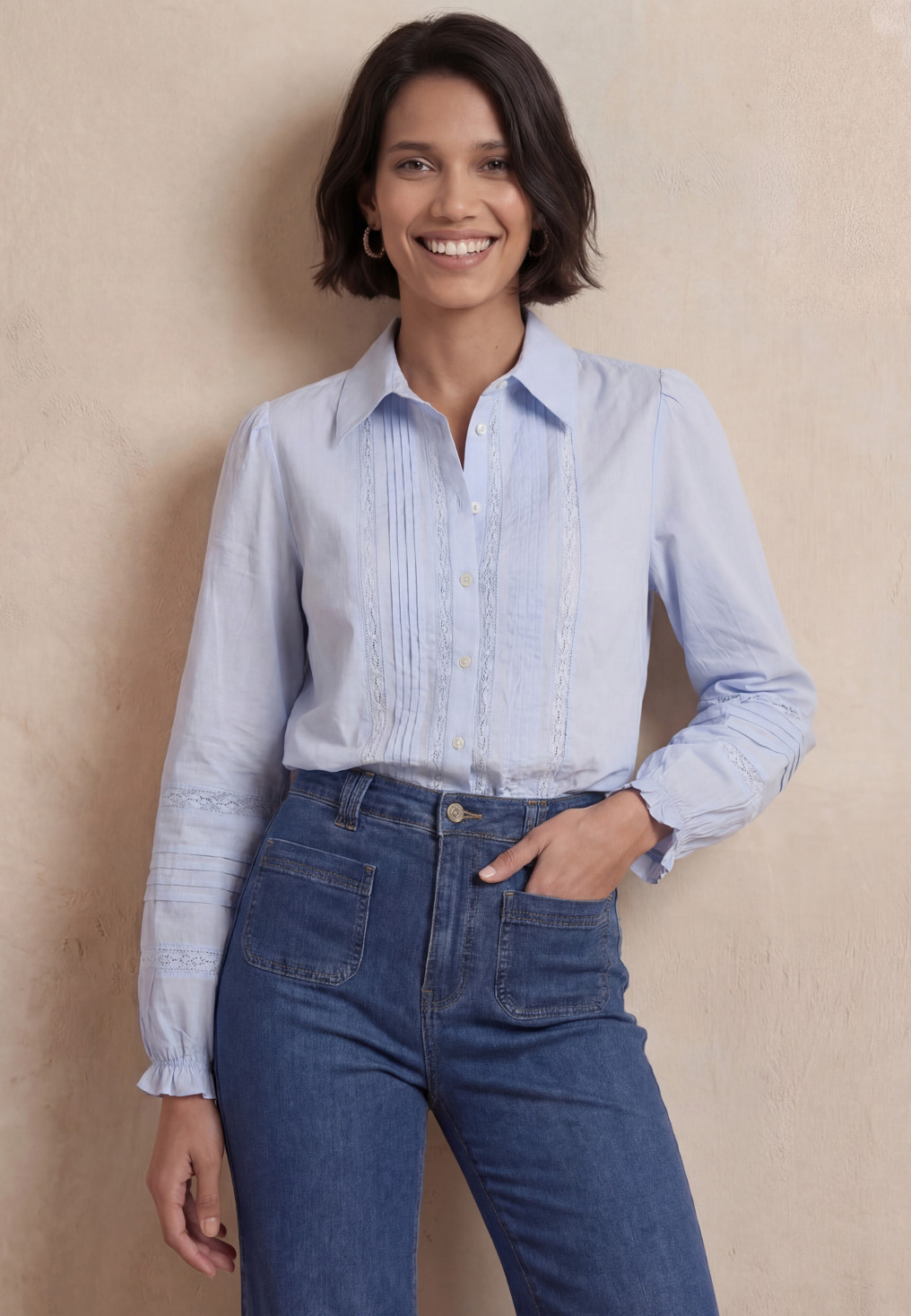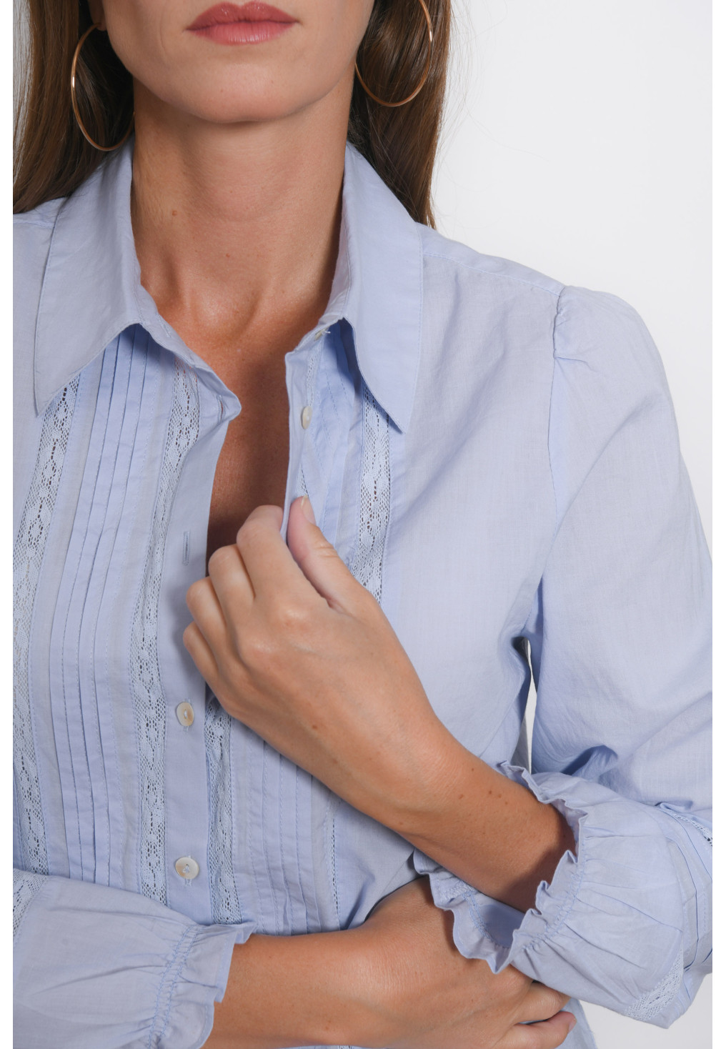 • Autour de la patte de boutonnage et sur les manches : détail des plis plats et du galon de dentelle