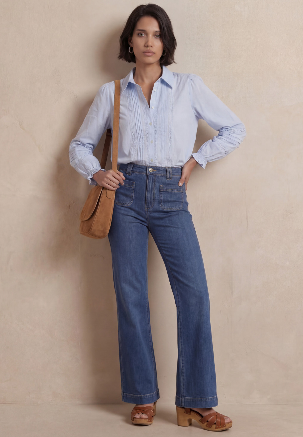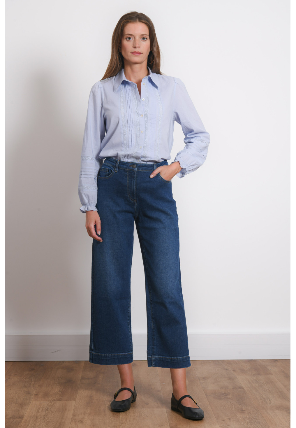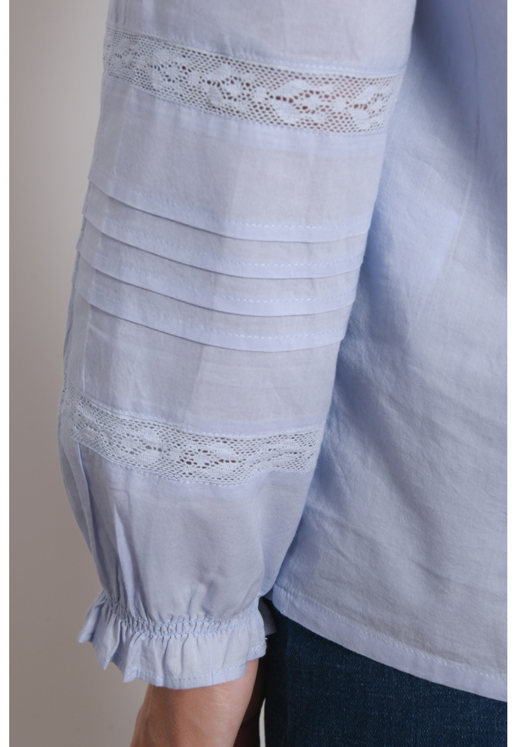• Autour de la patte de boutonnage et sur les manches : détail des plis plats et du galon de dentelle