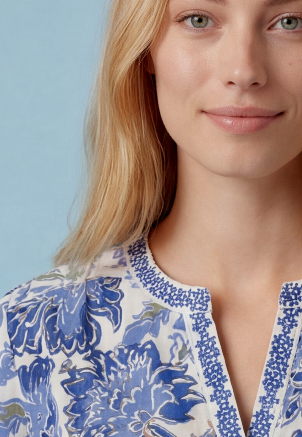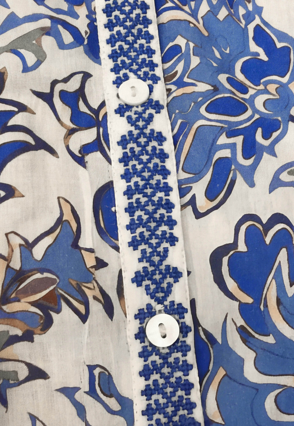 - Détail de la broderie contrastée sur le col, les poignets et la patte de boutonnage