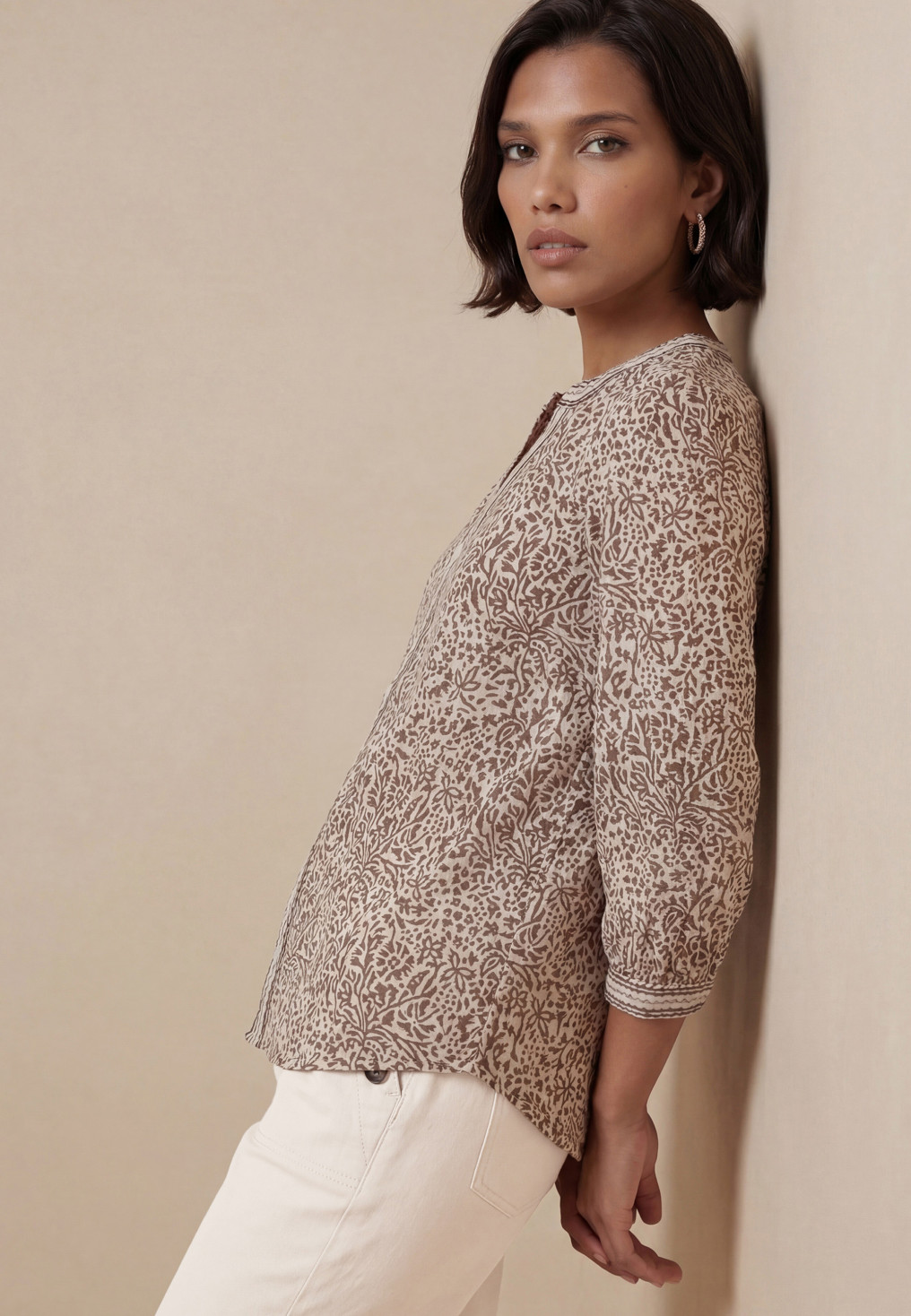 - Disponible en coloris corail/blanc et praline/blanc, motif floral stylisé