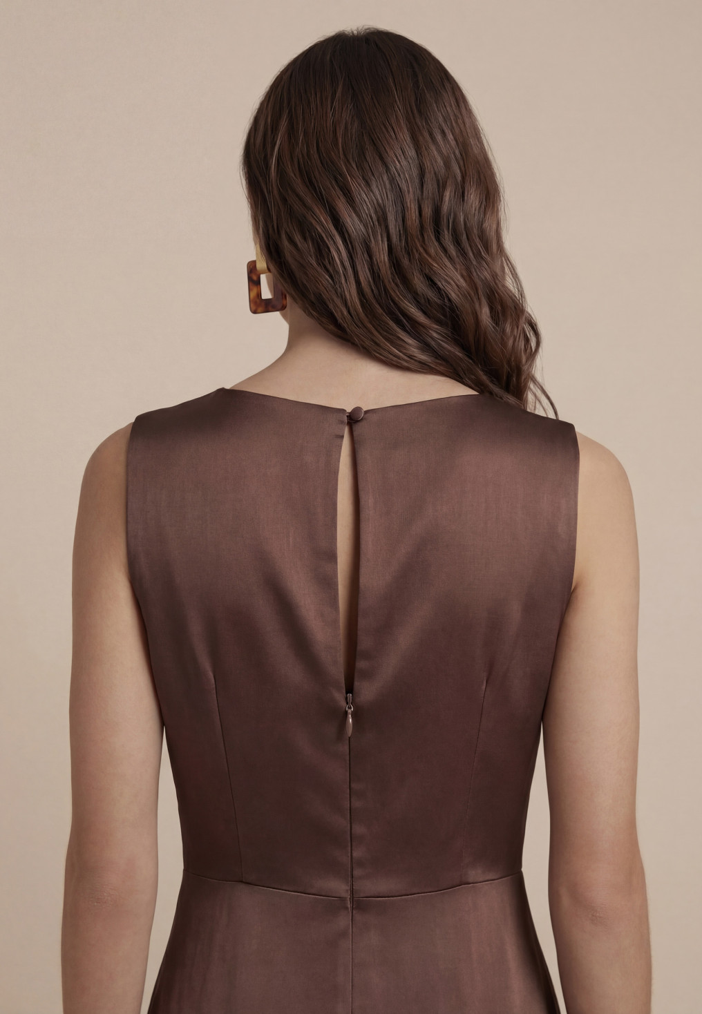 - Encolure bénitier, fente fermée par un bouton au dos