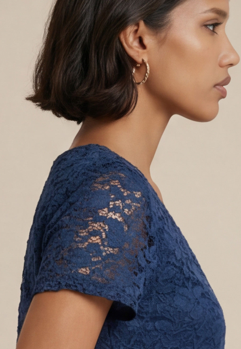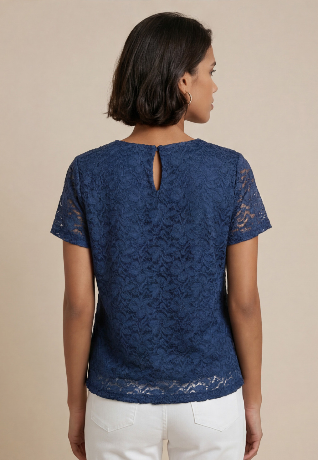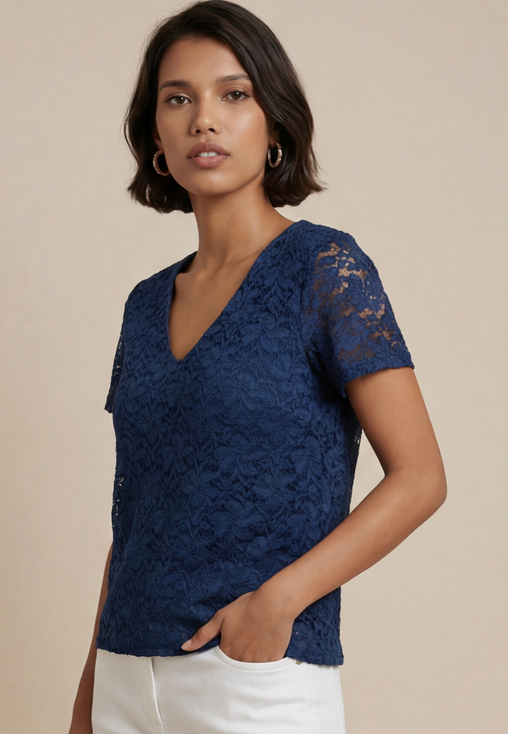 Top SAMARA en dentelle, devant et dos doublés, manches courtes transparentes