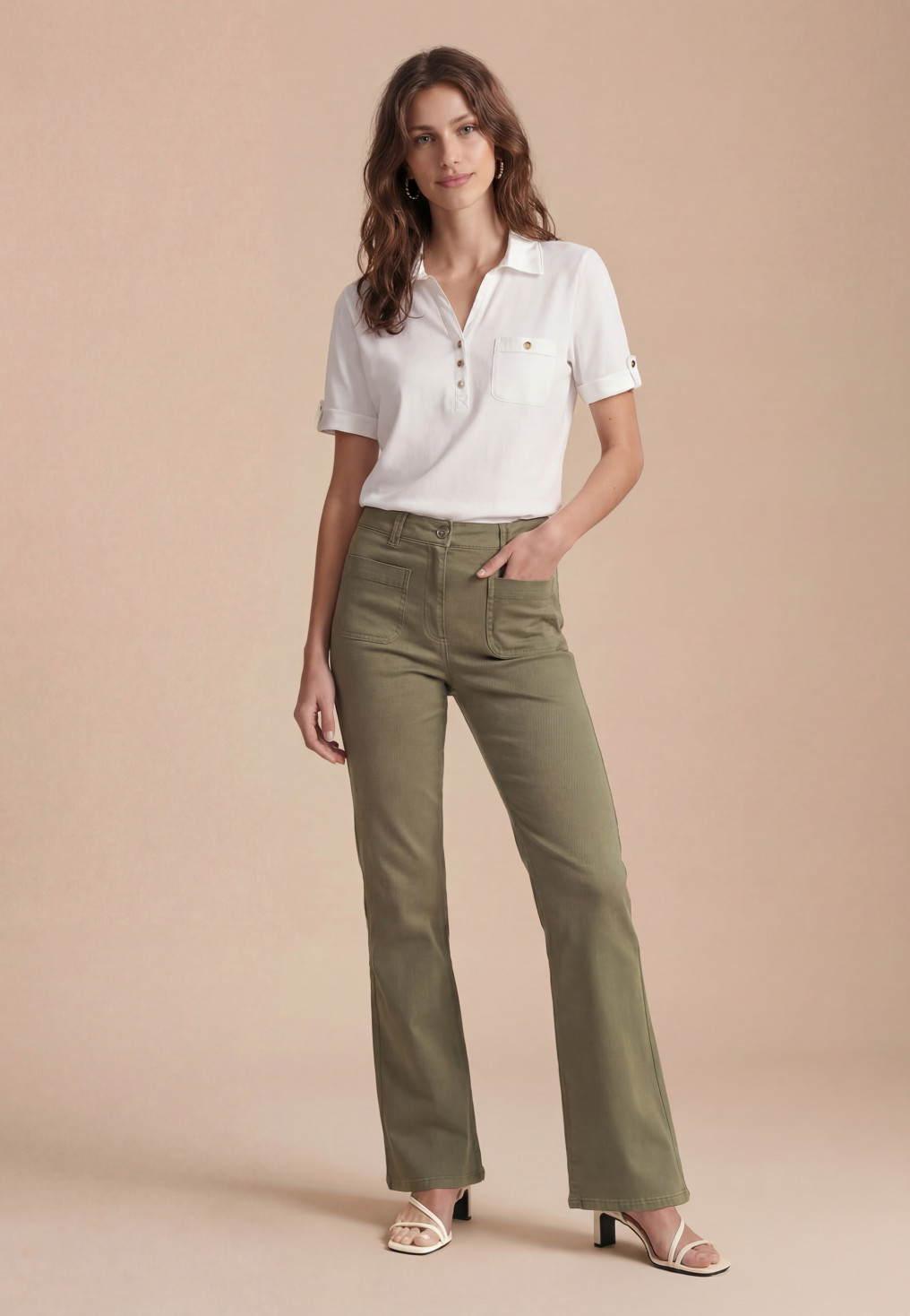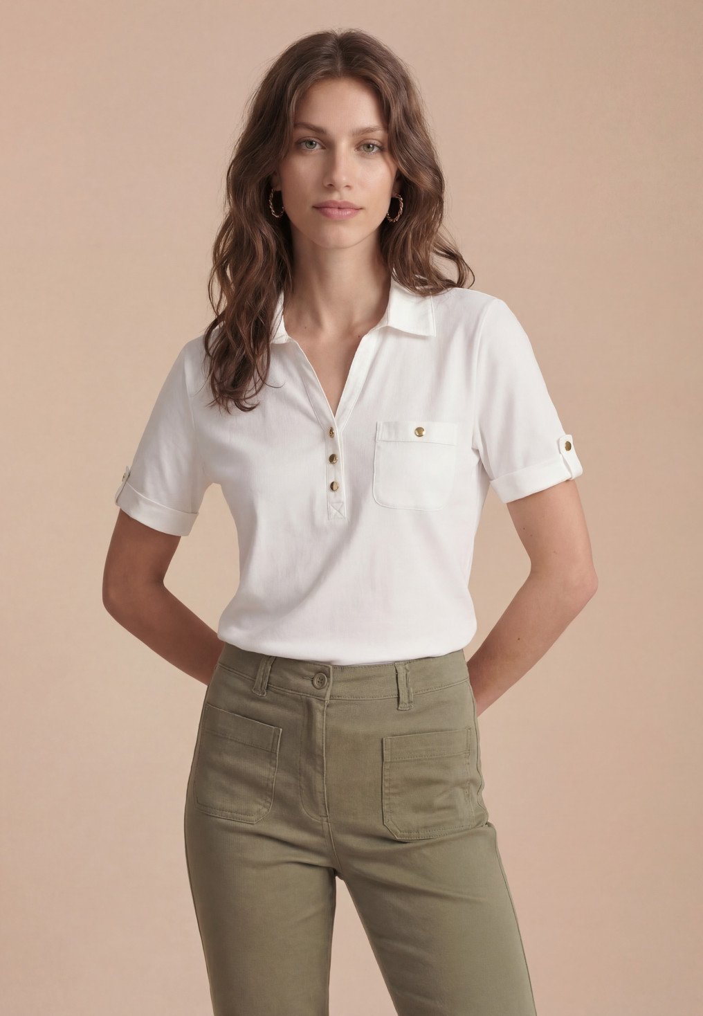 - Détail du contraste de matière ton sur ton sur le col, la poche et les pattes de boutonnage