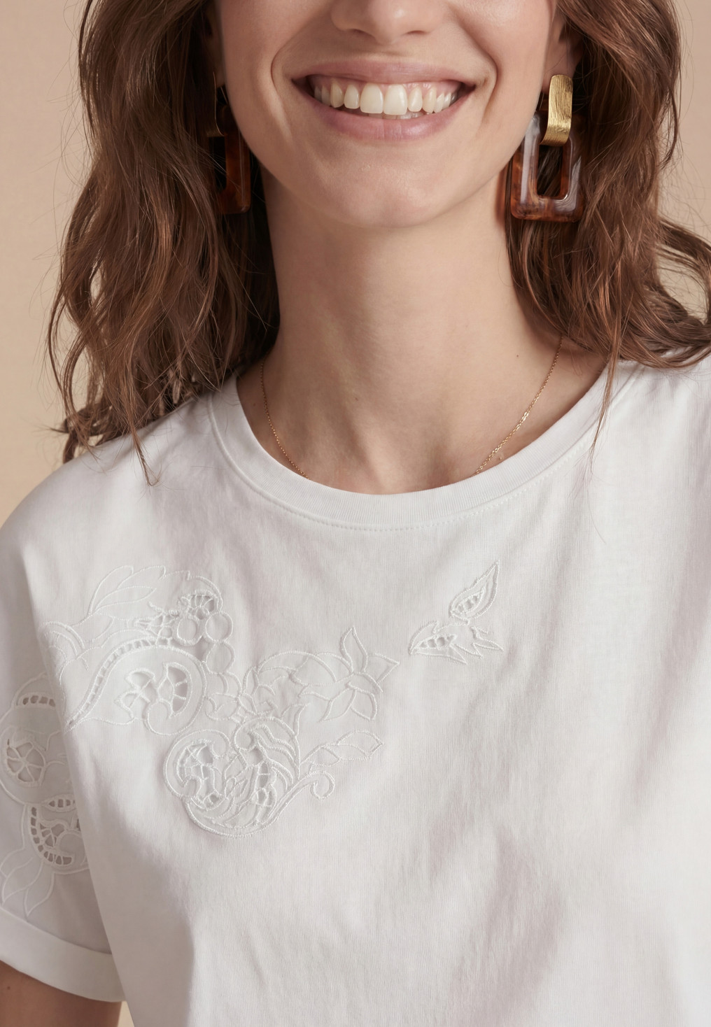 • Détail de la grande broderie florale ton sur ton avec effet ajouré