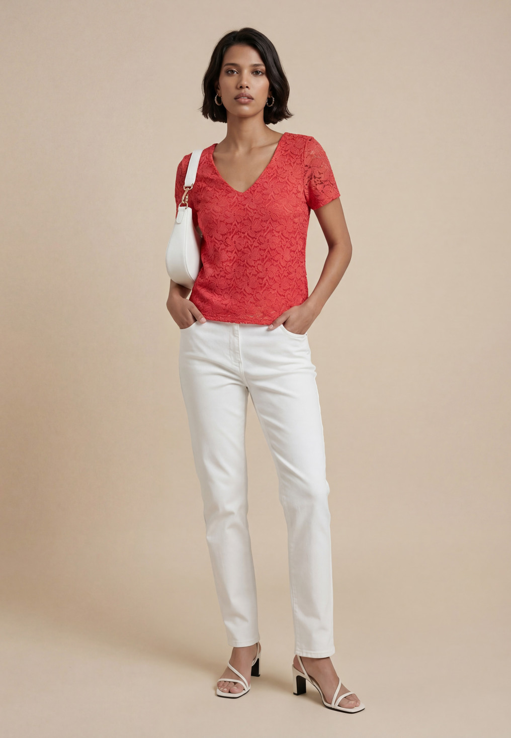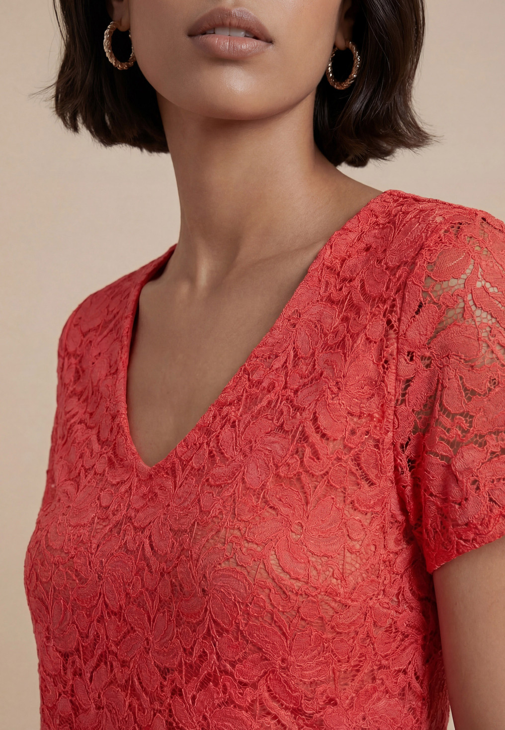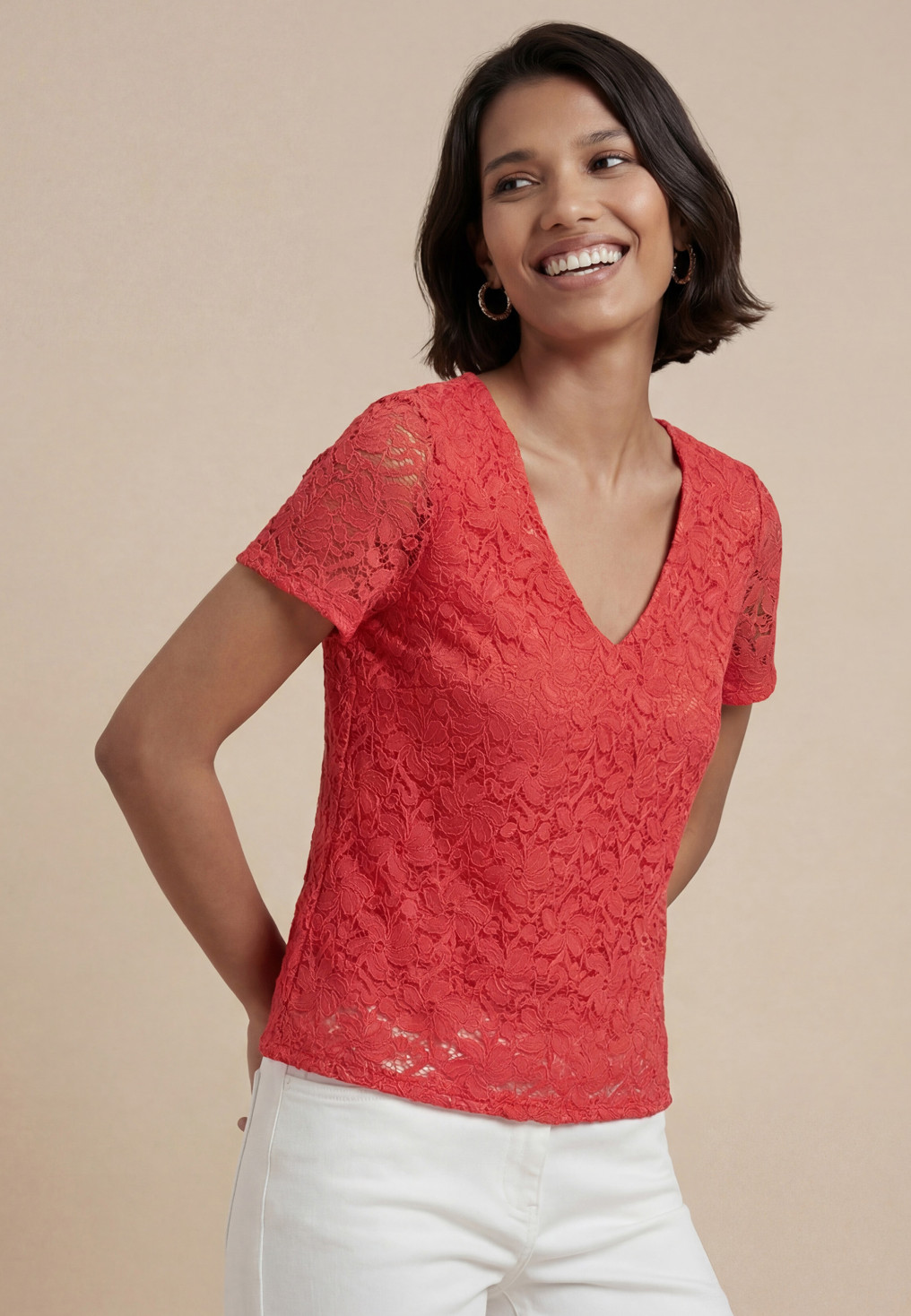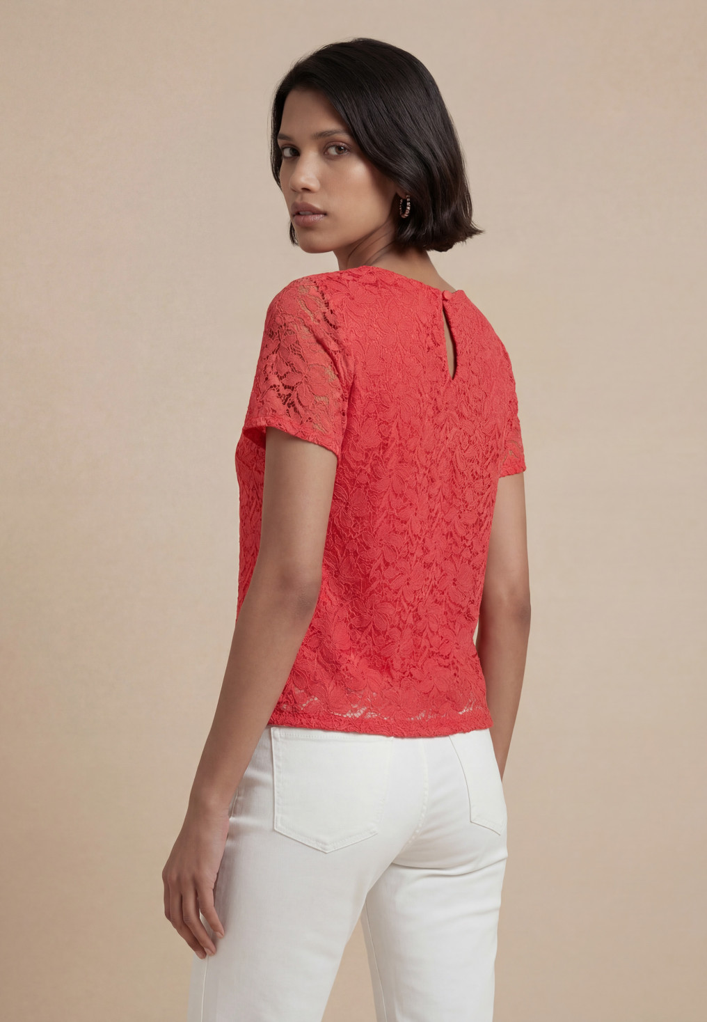 Top SAMARA en dentelle, devant et dos doublés, manches courtes transparentes