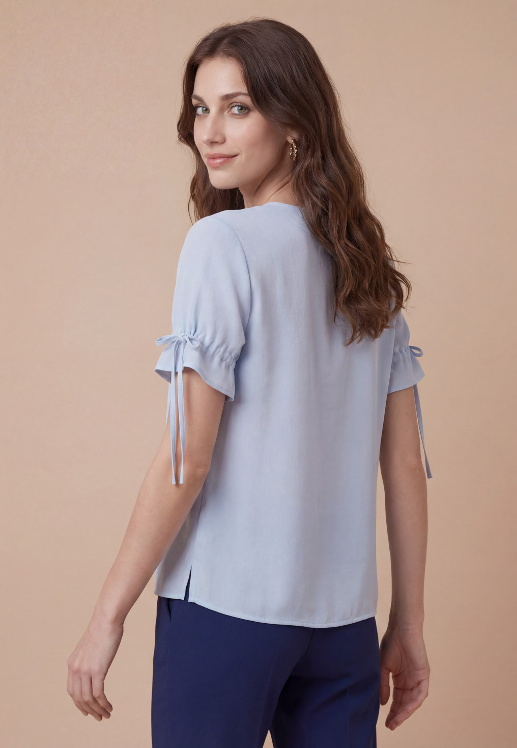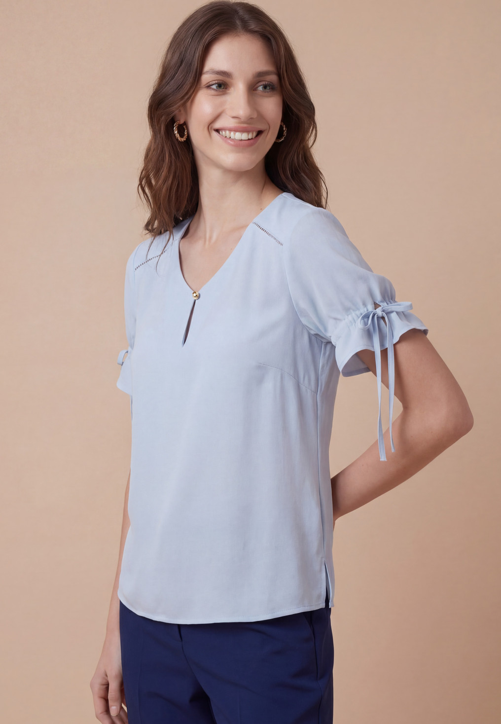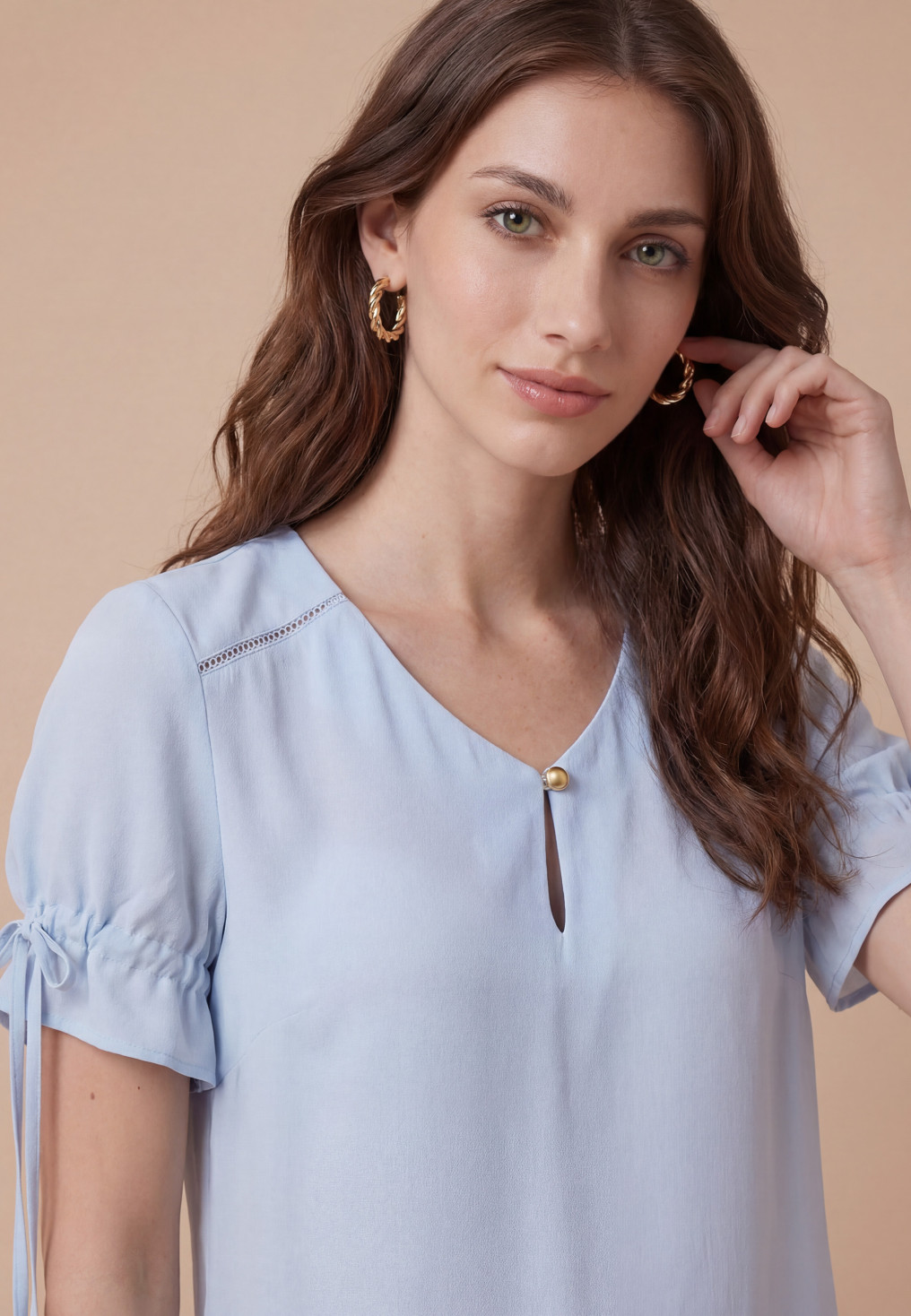 Top / blouse en soie VELSEN forme un peu loose, encolure V avec fente fermée par un mini bouton metallisé